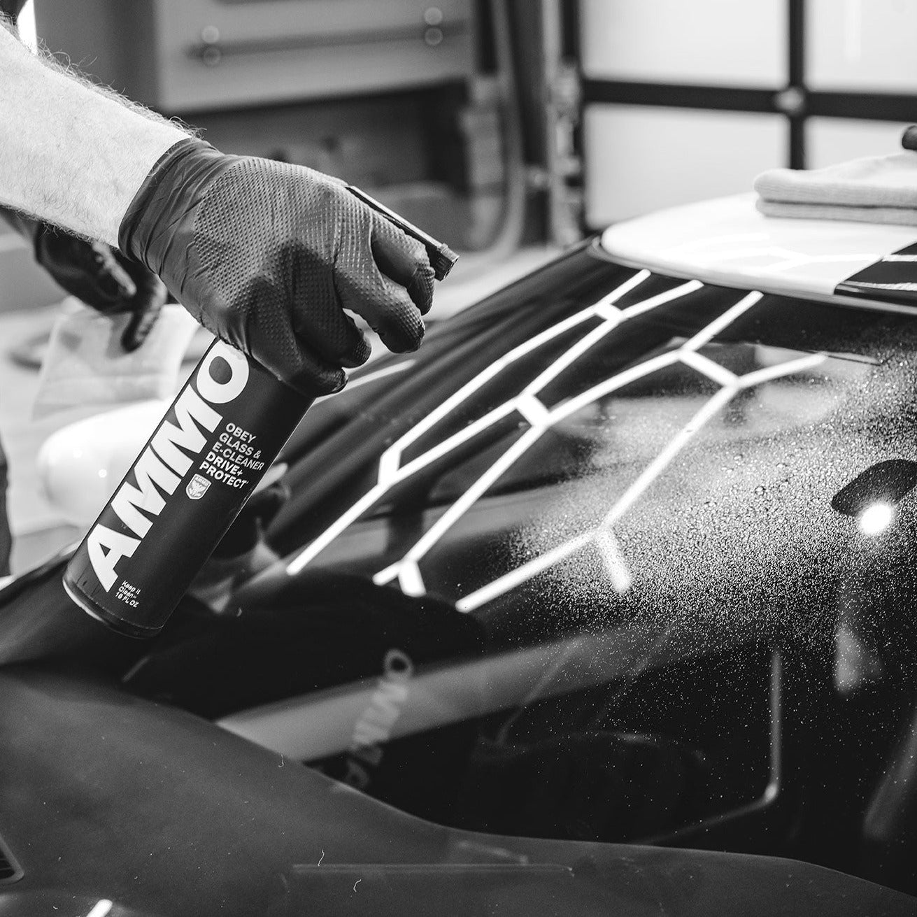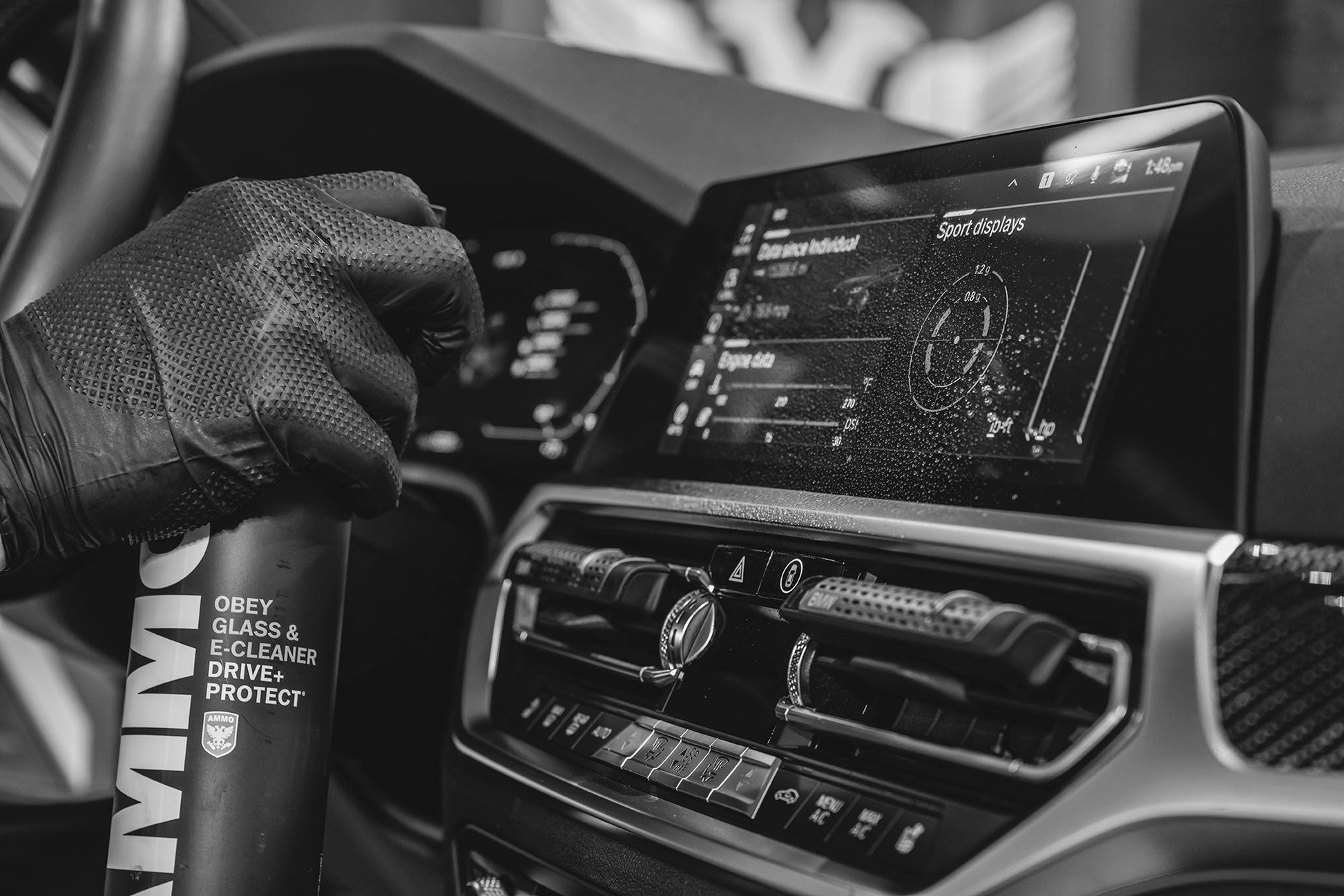 AMMO OBEY is a no-drip, no-streak automotive glass cleaner. It’s the first cleaner that actually obeys and won’t run or drip behind E-screens and surfaces, potentially damaging internal components. It's safe, non-toxic, eco-friendly, and minimizes fingerprints on most touch screens, consoles, and mirrors.
