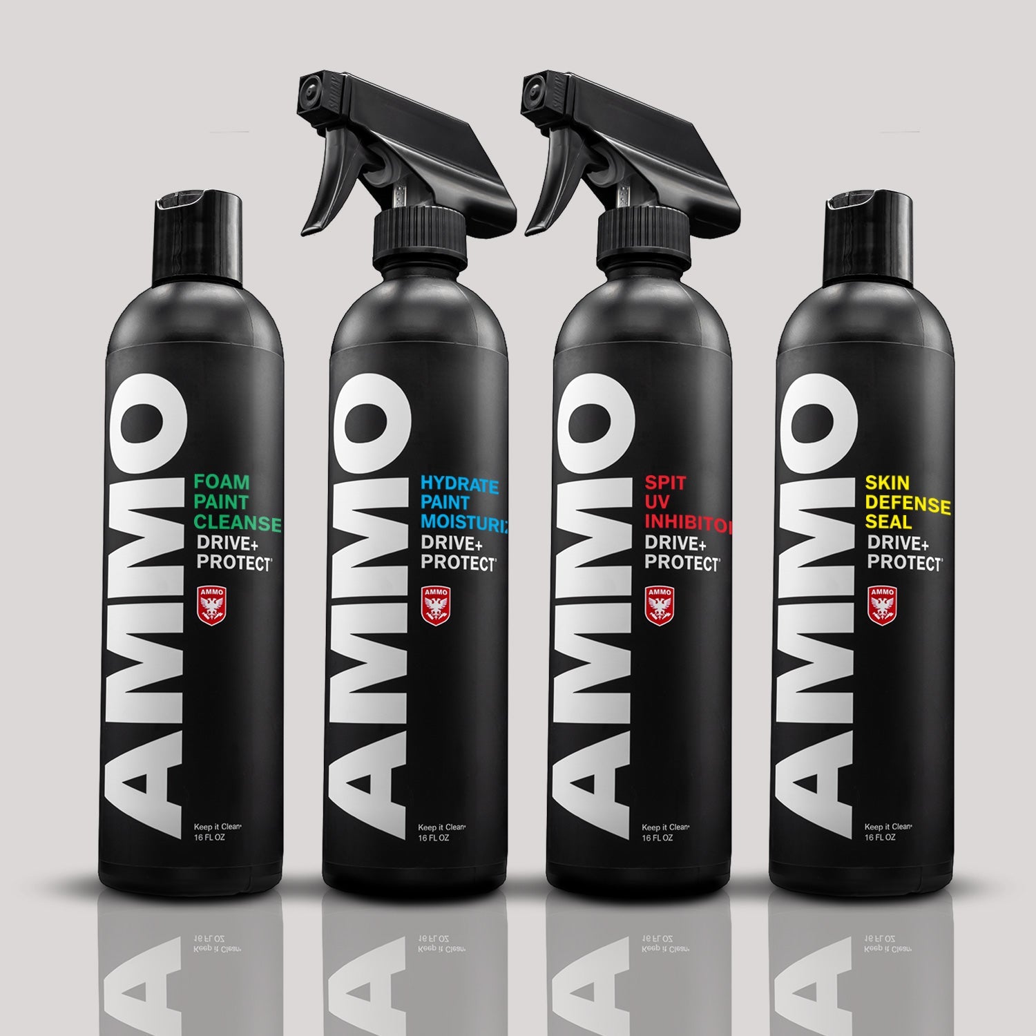 The AMMO PAINT REGIMEN KIT is the best way to safely clean and protect your paint, period. Start with AMMO FOAM, the paint cleanser that safely removes dirt while not harming the layers of protection on the car. Dry with AMMO HYDRATE to leave a beautiful, rich shine. Seal the paint with AMMO SKIN, a barrier that will protect your car’s paint for up to three months, and touch up as needed with AMMO SKIN, a versatile spray wax that leaves a gourmet finish.
