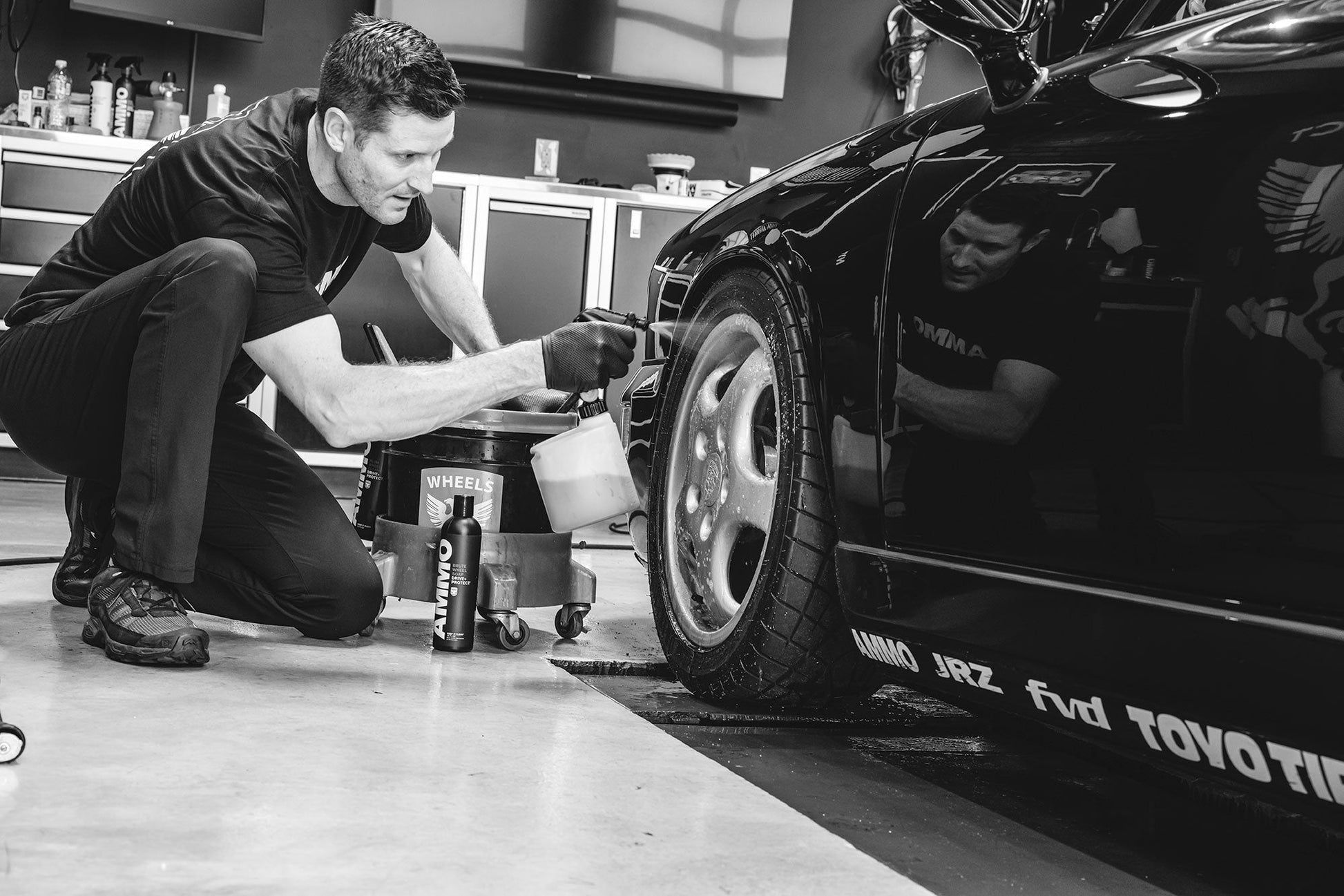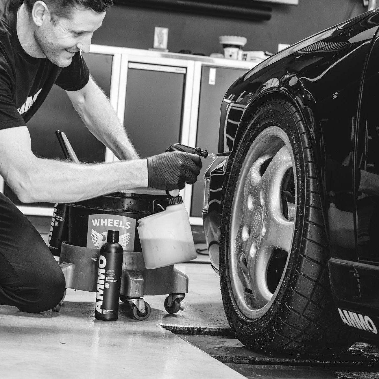 Custom AMMO Pivot Bottle features a patent pending sprayer that moves on the vertical axis allowing a full fan spray at any angle. Super convenient for detailing applications when working on paint, undercarriages, wheels, engine bays, and interior surfaces. The 32oz reservoir is compact and features fill + ratio markings for precise measurement and dilution. The Pivot Bottle is compatible with any AMMO Product that uses a sprayer or perfect for soap dilutions. Enjoy the AMMO Pivot Bottle with your favorite AMMO Cleaners and Maintainers with the unique flexibility of this tool.