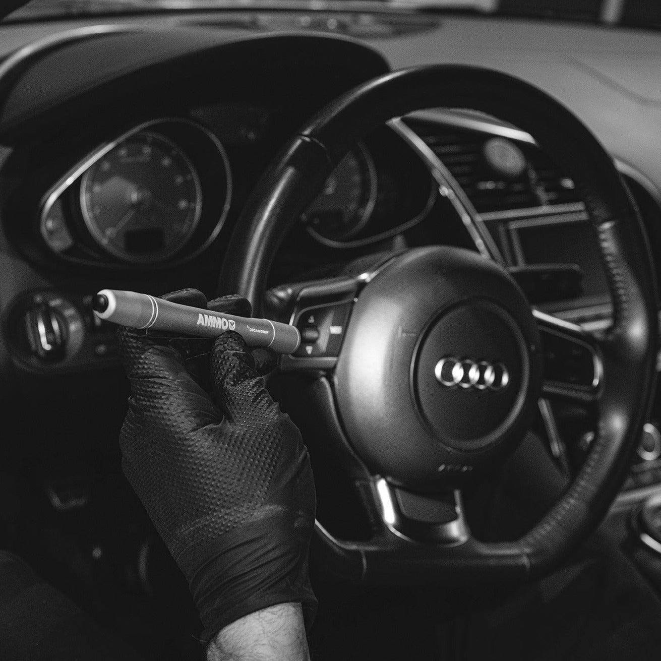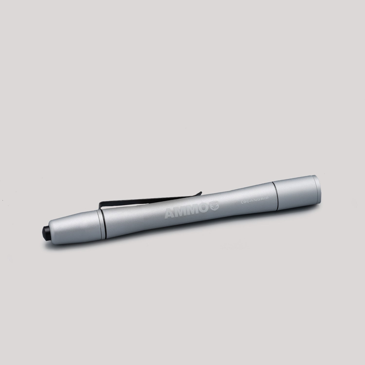 The AMMO REVEAL COLOR MATCH PEN LIGHT is a custom paint inspection tool featuring laser etched AMMO script on durable aluminum hardware. The Pen Light's 100 lumen light output illuminates paint imperfections for accurate detection of swirls, scratches, pinhole marks, and other defects. The Pen Light features a concentrated focus function from 10° to 70° with a solvent resistant glass lens. Comfortable design ergonomics and a handy built-in pocket clip are functional for every day use.The AMMO REVEAL is defined as CRI+ for accurate color matching and tested to the highest professional standards. The Pen Light is enclosed in a signature box with 2xAAA batteries.