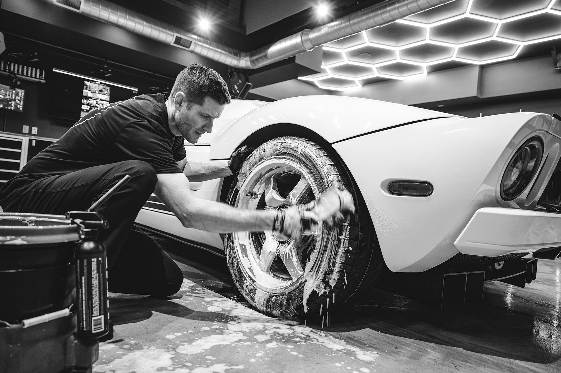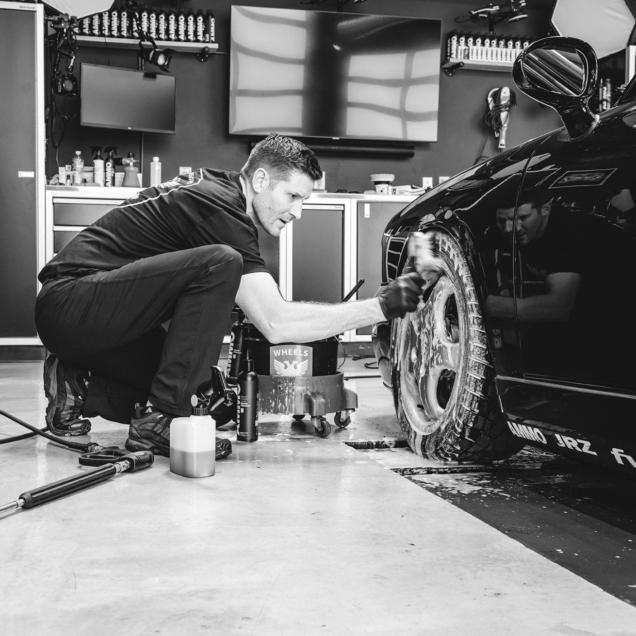 - Cleans wheel faces, tires, calipers, rotors, suspension, engine bays