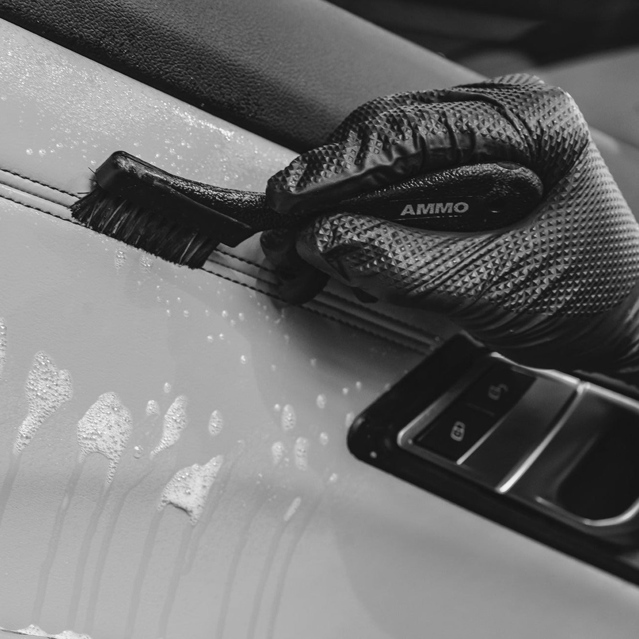 Contrast stitching – beautiful to behold, but maybe not so easy to clean. The AMMO SEAM + STITCH BRUSH will help you clean those hard to reach spots with its slim design. Medium stiff horse hair works great on steering wheels, tight trim pieces, leather and plastic.